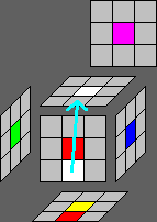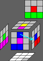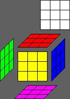 Rubik's cube solvingThis page explains how to solve a 3x3x3 cube. This cube is the most famous of the cubes and has a total of 3 x 3 = 9 faces per side. Each side is made up of 1 center, 4 edges, and 4 corners. With 6 sides this makes for 6 centers, 24 edges, and 24 corners, for a grand total of 54 faces. Each center is alone, each edge is paired with 1 other edge, and each corner is paired with 2 other corners. This makes for a grand total of 6 + 12 + 8 = 26 blocks. The pictures show you how to go about solving the cube. Make sure you always have the exact correct orientation or the supplied moves will not work properly. None of the moves require you to change the position or orientation of the cube once you start a sequence. Remember to first check the general instructions page if you're new to my solutions. |